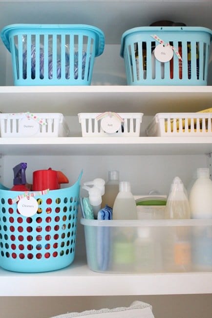 • Put things you already have on hand to better use. If you have baskets, store electrical cords, toys or towels in them. Shoe organizers also are great for cleaners, paper products or even tools. Two birds, one stone.